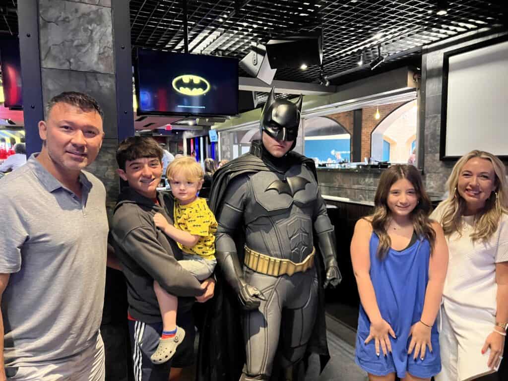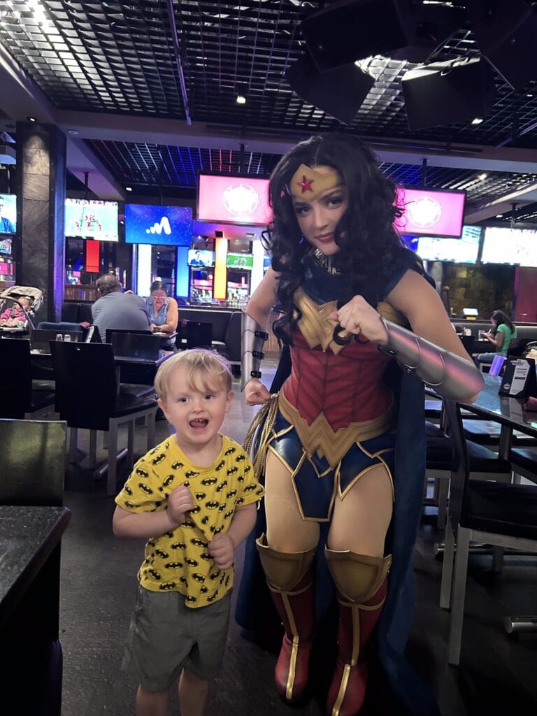But the highlight of the trip? Meeting real-life DC Superheroes! When Annikin saw Superman and Wonder Woman in person, his face absolutely lit up. He was a little shy at first, but by the time Batman gave him a high five, he was in full superhero mode—cape and all!